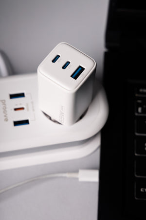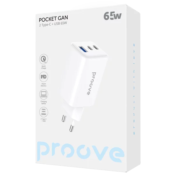 Karikues muri Proove Pocket, 65W, me 2×Type-C dhe USB, i bardhë