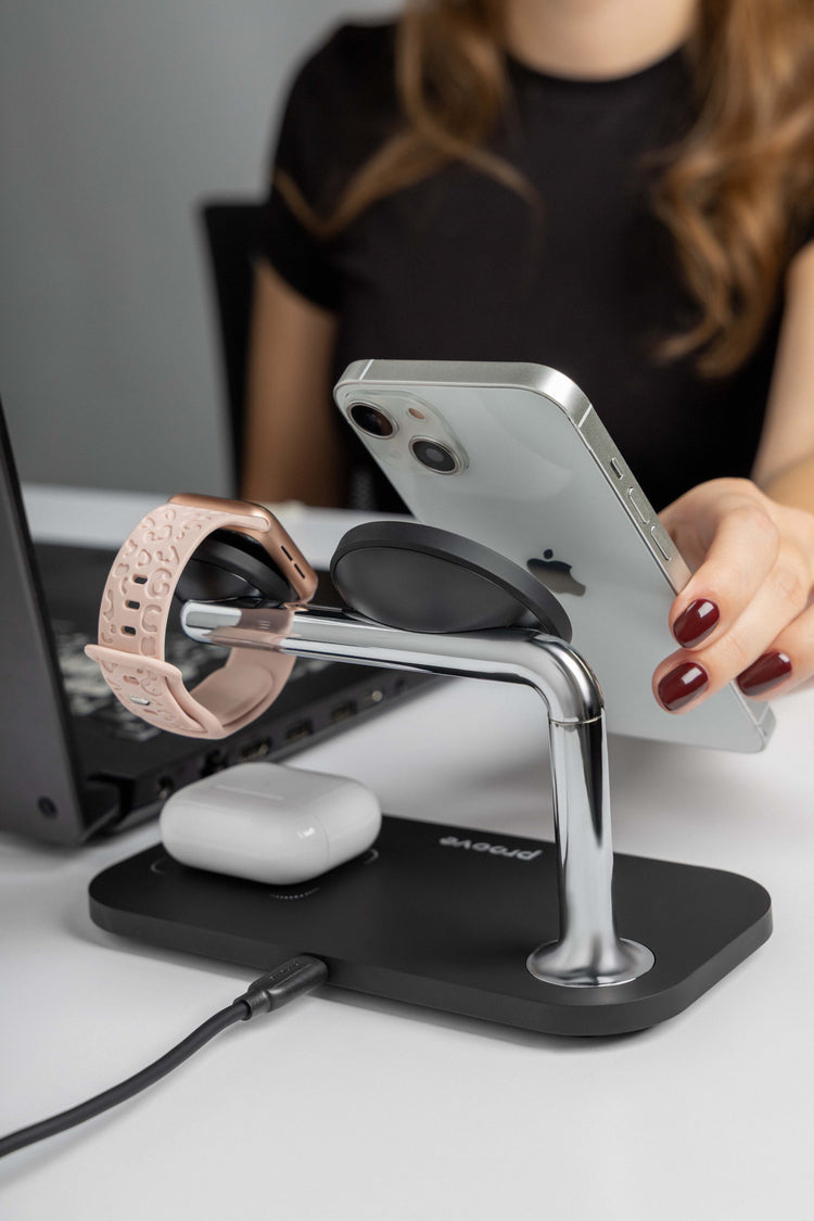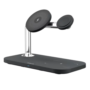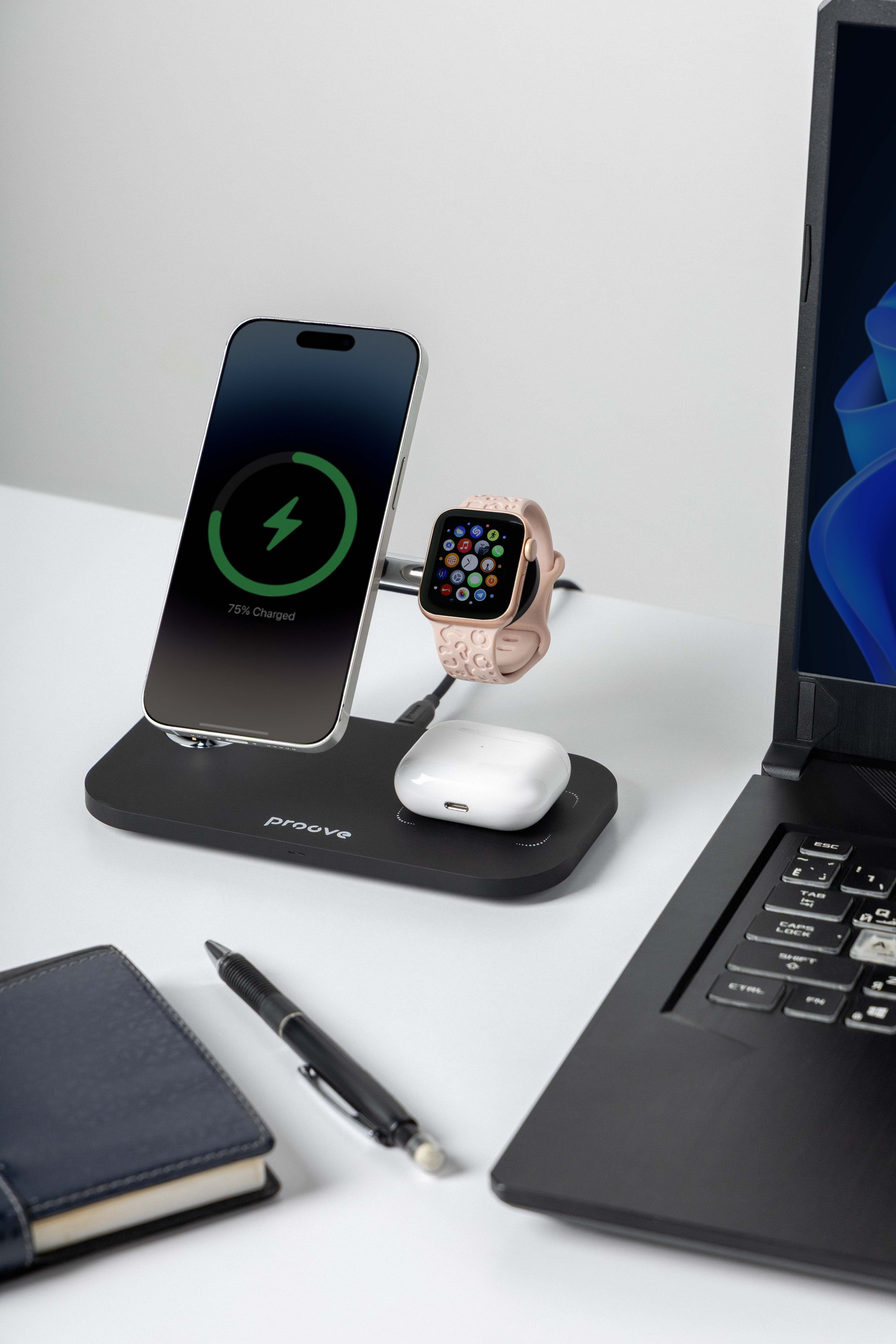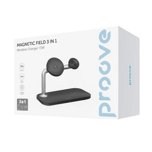 Karikuesi wireless 3 në 1 Proove Magnetic Field është projektuar për karikim të njëkohshëm të smartphone-it, kufjeve wireless dhe orës inteligjente. Me fuqi maksimale 15W dhe mbështetje për standardin Qi, ofron karikim të qëndrueshëm dhe praktik në një stacion të vetëm. Dizajni me strukturë magnetike dhe ndërtim prej ABS dhe aliazh alumini e bën të përshtatshëm për tavolinë pune ose komodinë.