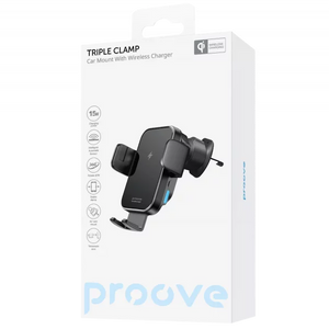 Proove Triple Clamp është mbajtëse për telefon me karikim wireless të integruar deri në 15W, e përshtatshme për montim në ventilimin e makinës ose në sipërfaqe të sheshta. Me kapëse mekanike dhe bazë vakumi opsionale, ofron stabilitet të lartë gjatë lëvizjes. E kompatibilshme me smartphone nga 4.0″ deri në 6.9″, është zgjidhje praktike për navigim dhe karikim njëkohësisht.