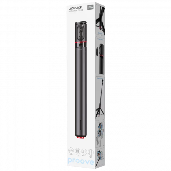 Proove DropStop është tripod me hapje automatike i projektuar për stabilitet dhe fleksibilitet maksimal gjatë fotografimit ose xhirimit. Me gjatësi deri në 177 cm kur hapet plotësisht dhe dizajn kompakt kur paloset, është i përshtatshëm për udhëtime dhe përdorim të përditshëm. Kombinimi i ABS dhe aliazhit të aluminit siguron qëndrueshmëri dhe peshë të balancuar.